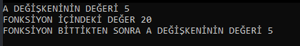 cout << "FONKSİYON BİTTİKTEN SONRA A DEĞİŞKENİNİN DEĞERİ " << a << endl;
