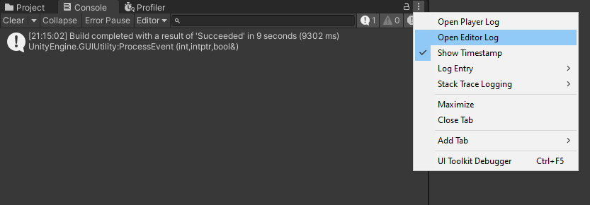 Öncelikle “Console” pencereniz açık değilse Window > General > Console yolunu izleyerek pencere düzeninize Console’u ekleyebilirsiniz. Ardından üç noktaya tıklayıp “Open Editor Log” derseniz çeşitli derleme bilgilerini görebileceğiniz .txt dosyası açılacaktır.
