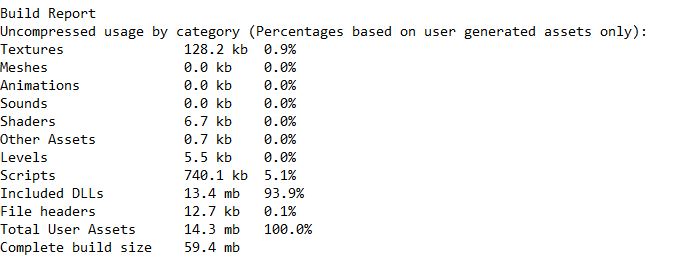 Build aldıktan sonra Editor.txt dosyasının alt kısımlarına bakacak olursanız aşağıdaki gibi build verileri ile karşılaşacaksınız. Bu verilere bakıp projenizin boyutunu düşürebilir veya fikir edinebilirsiniz.